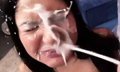 Dirty bukkake covers her face completely in semen