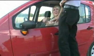 Aroused gf stops her boyfriend's car to blow him with intensity