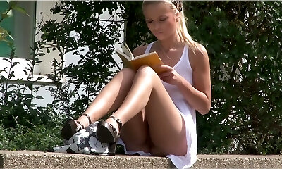Sexy teen fledgling les fingering and licking pussy outdoors