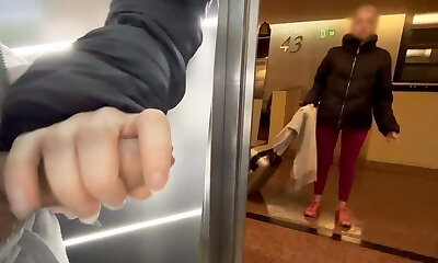 An unknown sporty nymph from the motel gives me a blowjob in the public elevator and helps me conclude cumming
