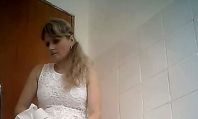 Fine bodacious blonde lady in white dress filmed in the toilet room
