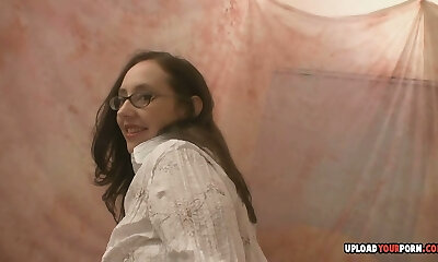 Chubby brunette nerd kneaded a dildo and wants more
