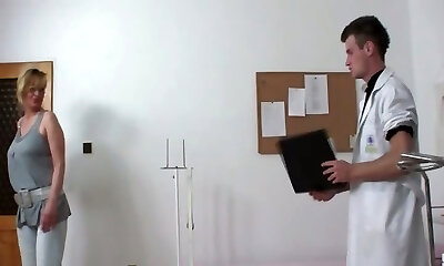 Lustful light-haired doctor milks young hunk's Big Black Cock during monthly checkup