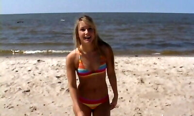 Hula hooping hottie on the beach in a colorific bikini