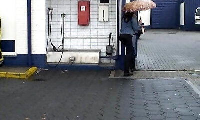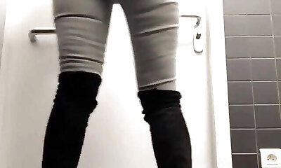 White chick in blue jeans and coat pisses in the rest room