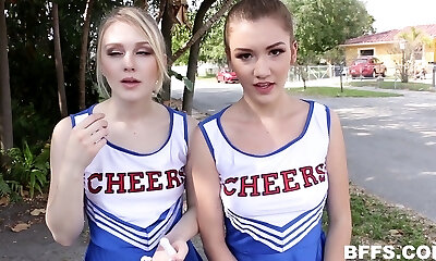 2 Steamy College Cheerleaders Cute and Horny Blonde and Her Brunette Tight Pussy BFF rides a Big Cock and Swallow Cum